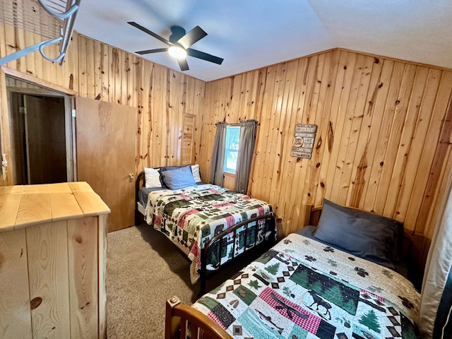 Two bedroom cabin on the lake side. One bedroom has a queen bed and the other bedroom has a double bed and a twin bed. Screened-in porch. Charcoal grill and small bonfire ring.
