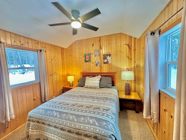 Two bedroom cottage on the waterfront with large lakefront window and a corner, gas-woodstove. One bedroom has a queen bed and the other bedroom has a double/ twin bunk bed. Charcoal grill and small bonfire pit.