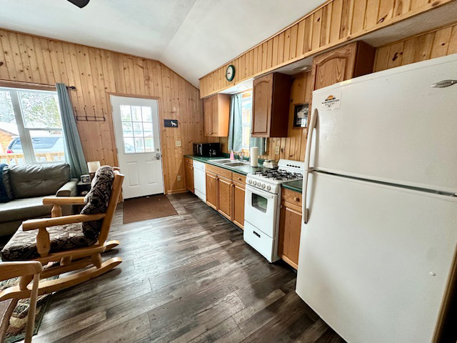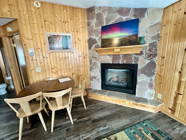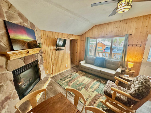 Newly remodeled, two bedroom cabin with a queen bed in one room and 2 queen beds in the other room. Living room with a gas fireplace. Located just across the street from the lake. Full beach access. Charcoal grill and small bonfire pit.